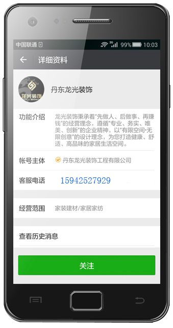 2、打開微信,在搜號碼中搜索“丹東龍光裝飾”;有