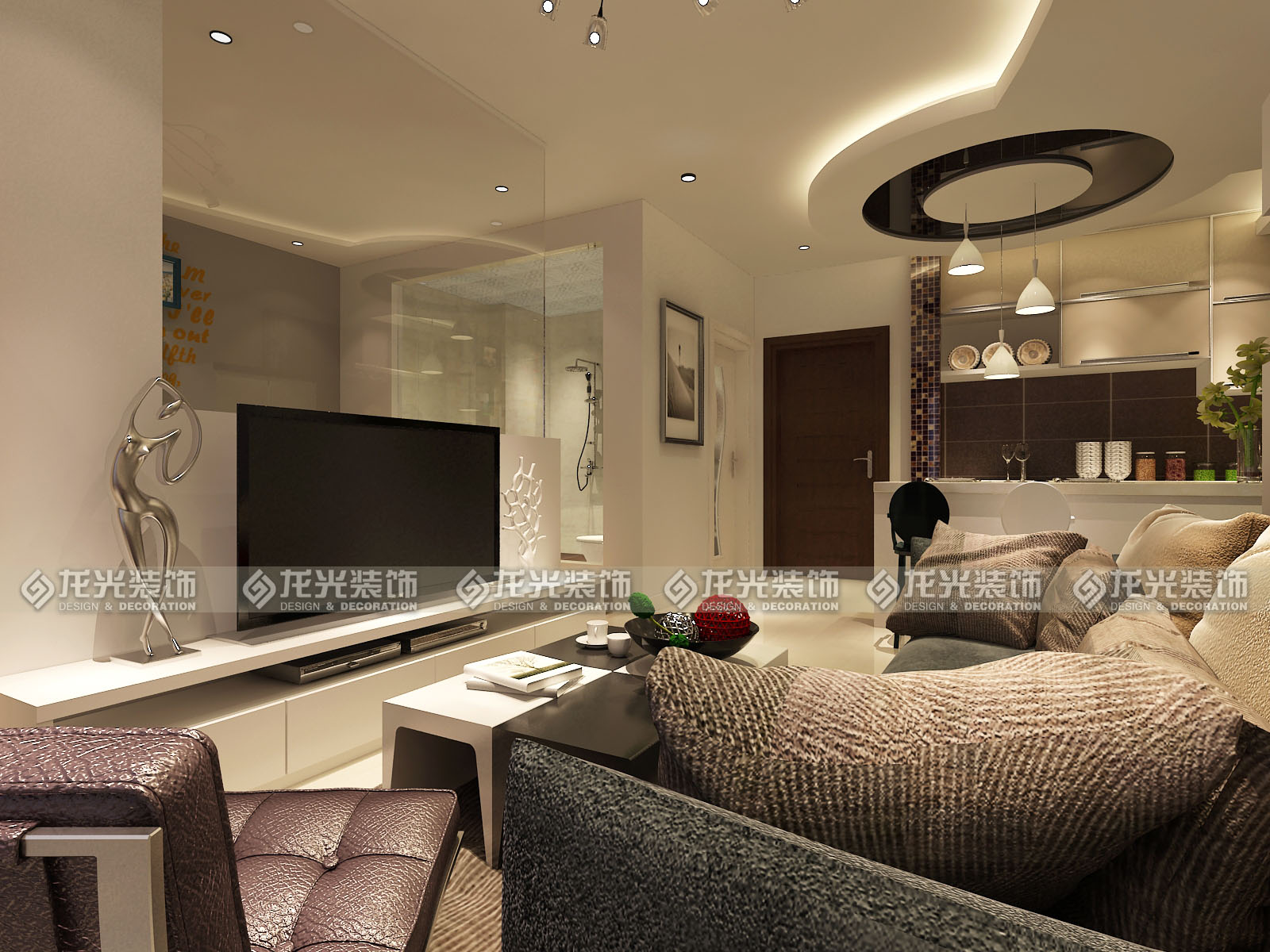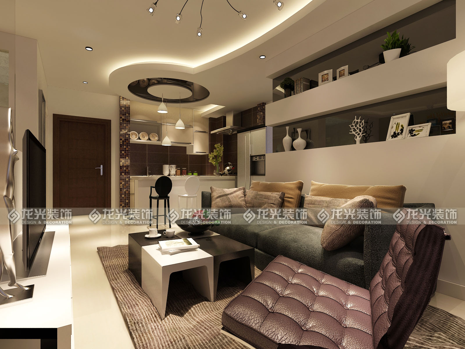 本案是給一對(duì)年輕夫婦打造的休閑度假公寓,定義為現(xiàn)代風(fēng)格,用黑白灰三色為主色調(diào),材質(zhì)以鏡面,瓷磚,壁紙來(lái)搭配,墻體的拆除將整個(gè)房間的空間感打開(kāi),頂面圓弧型的造型讓空間更為靈動(dòng),不單一,敞開(kāi)廚房,通透的衛(wèi)生間玻璃,都為了讓整個(gè)空間顯得格外明亮。