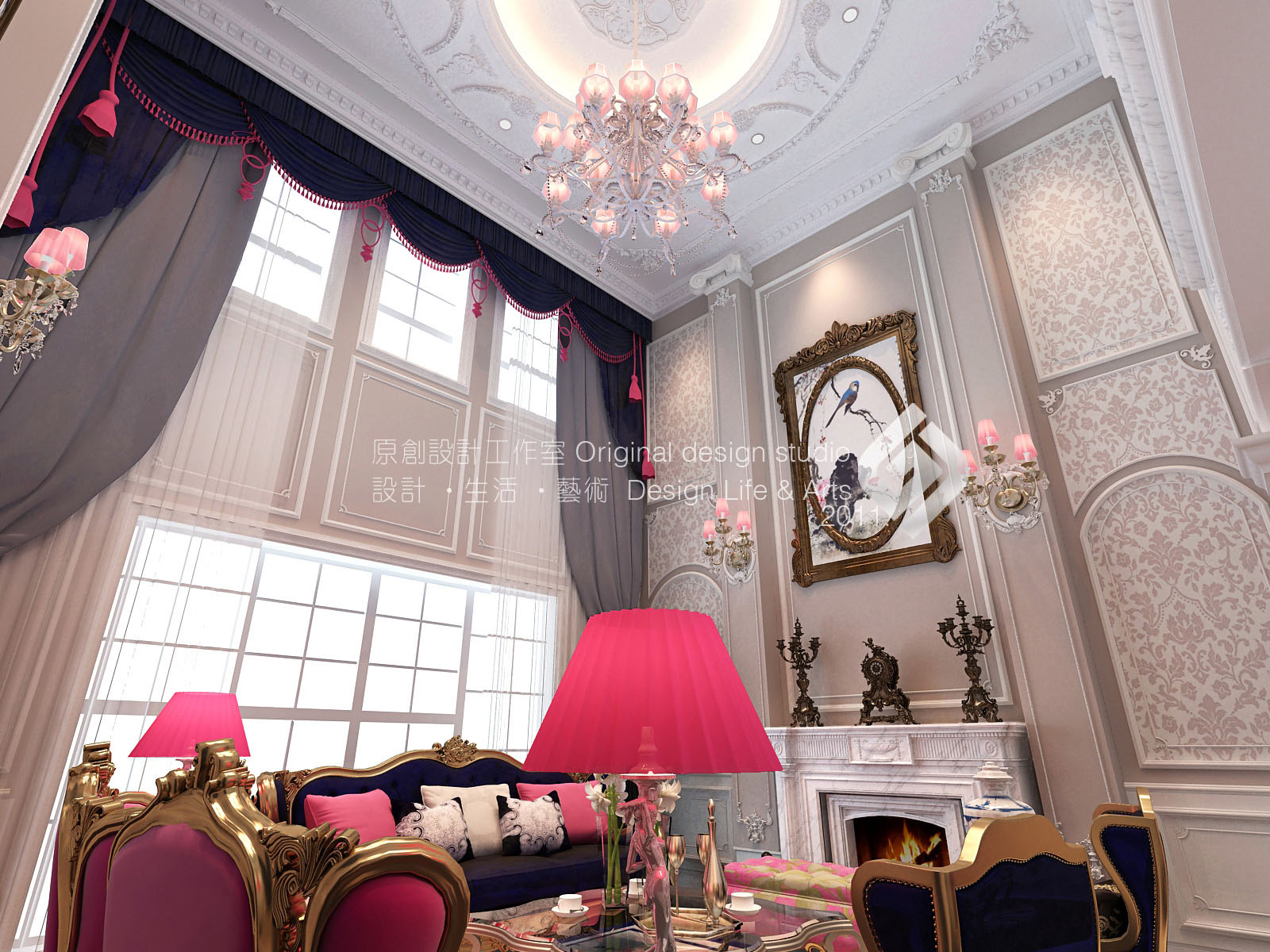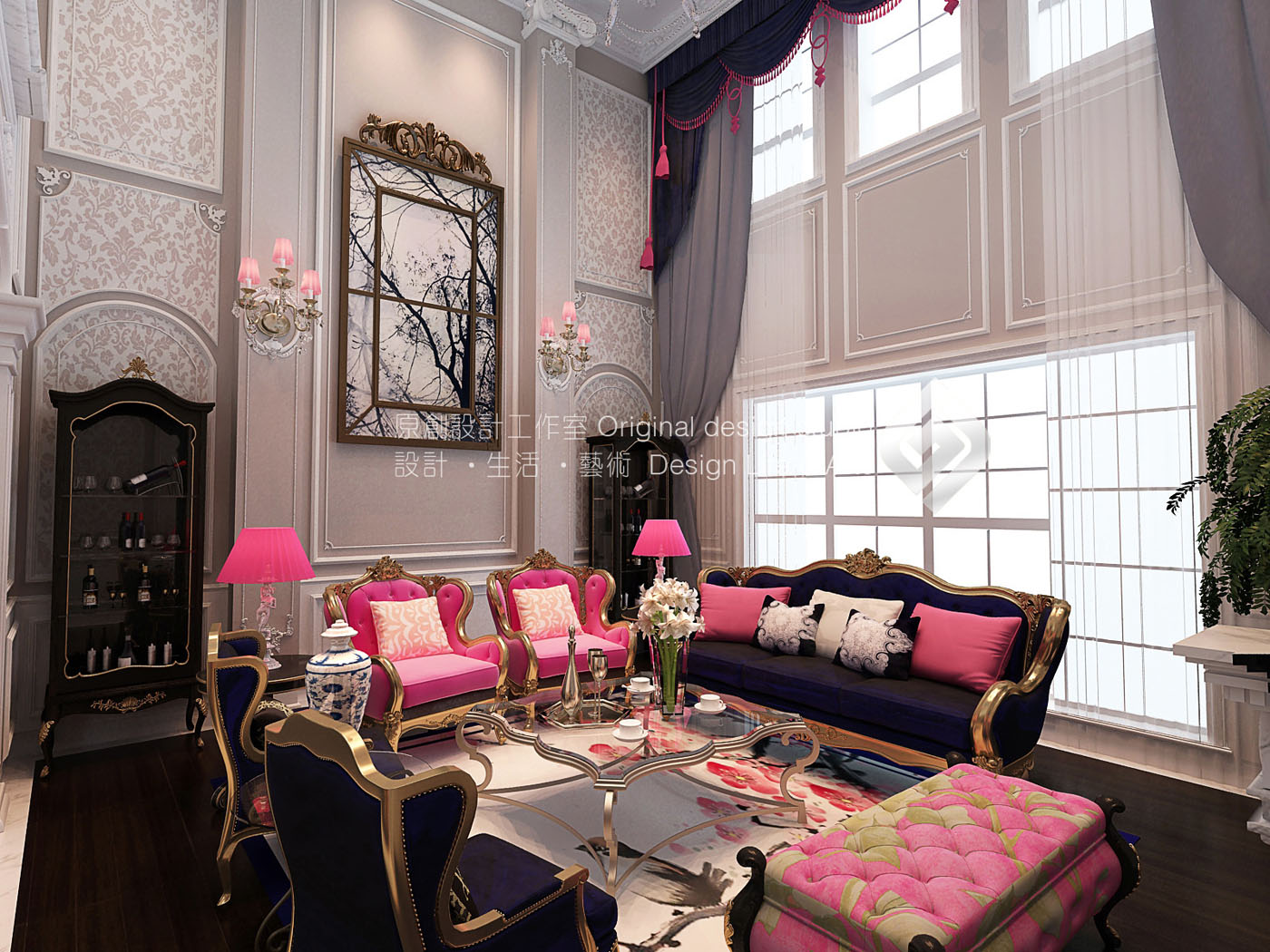 本案立意《巴黎漫步》,設(shè)計(jì)師希望以這座浪漫的城市為主線展開(kāi)他的設(shè)計(jì),精致的構(gòu)件、雕花以及軟裝點(diǎn)綴的米白,玫紅,藏藍(lán),其表現(xiàn)為:風(fēng)格鮮明,時(shí)尚,浪漫。