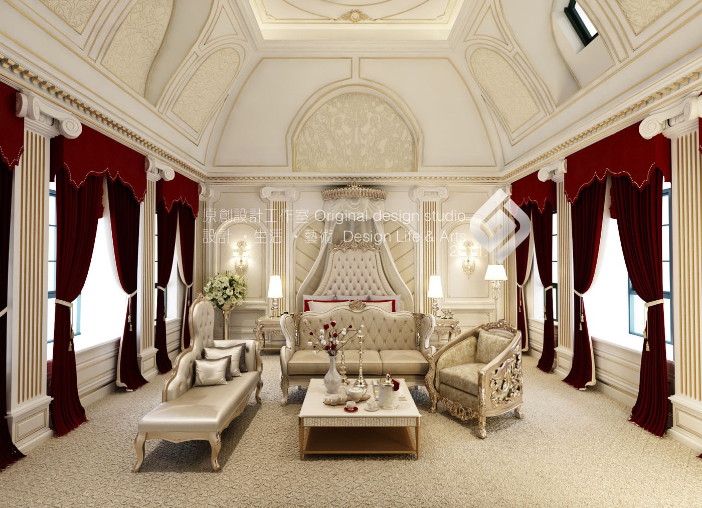 墻面以淺色木作墻板為主,搭配墻紙,營造出一種溫馨又華麗的感覺,地面顏色稍深,配合淺色家具和留金飾品及燈具進一步彰顯貴族風范。