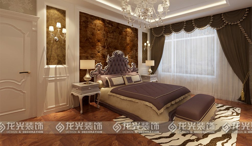 6、主臥室吊頂采用網格式吊頂,體現了歐式元素,使比較大的棚面變得更加精致,細膩,床頭背景是用護墻板,壁紙和軟包材質相結合,使得背景墻做出來更加顯得大氣美觀,臥室地面采用實木拼花地板,體現年輕業主富有年輕張揚的性格,更加體現了奢華的裝修風格。