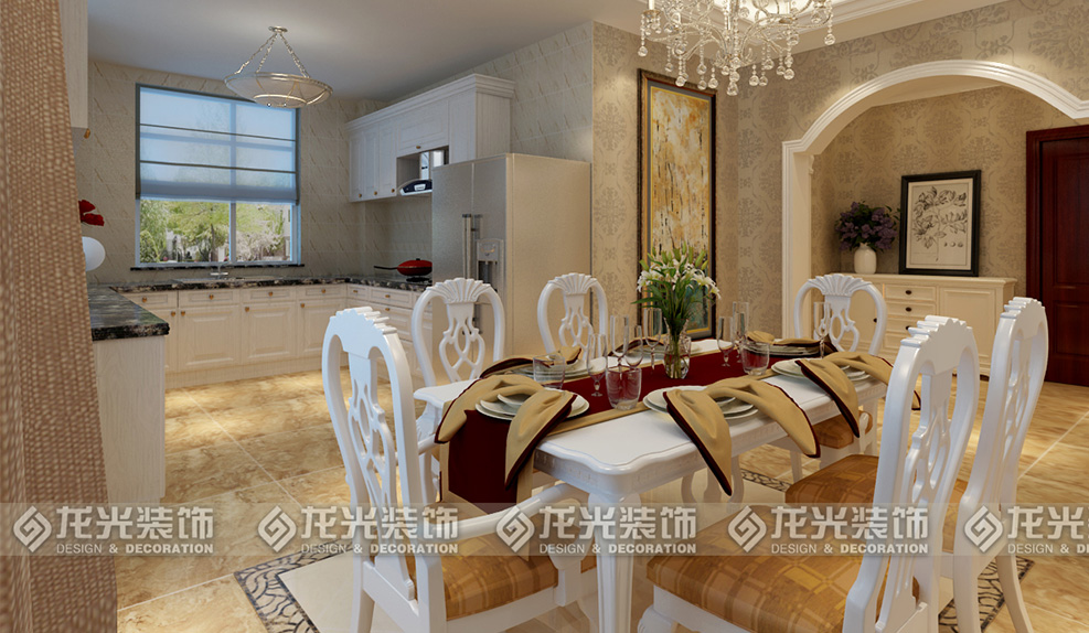 2、餐廳區域的左側為白色歐式酒柜,對面配以油墨畫的設計彰顯出主人的浪漫的情調,地面采用深淺地磚顏色搭配巧妙的做出了餐廳區域劃分。在這個區域里的櫥柜.酒柜.餐桌的顏色都是采用象牙白色,以體現歐式風格的簡潔大方。