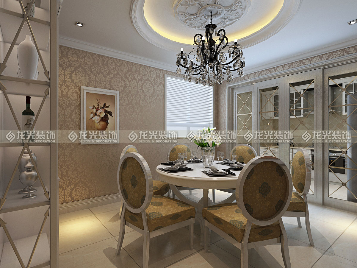2、餐廳區域的為白色歐式酒柜,對面配以油墨畫的設計彰顯出主人的浪漫的情調,在這個區域里的櫥柜.酒柜.餐桌的顏色都是采用象牙白色,以體現歐式風格的簡潔大方。