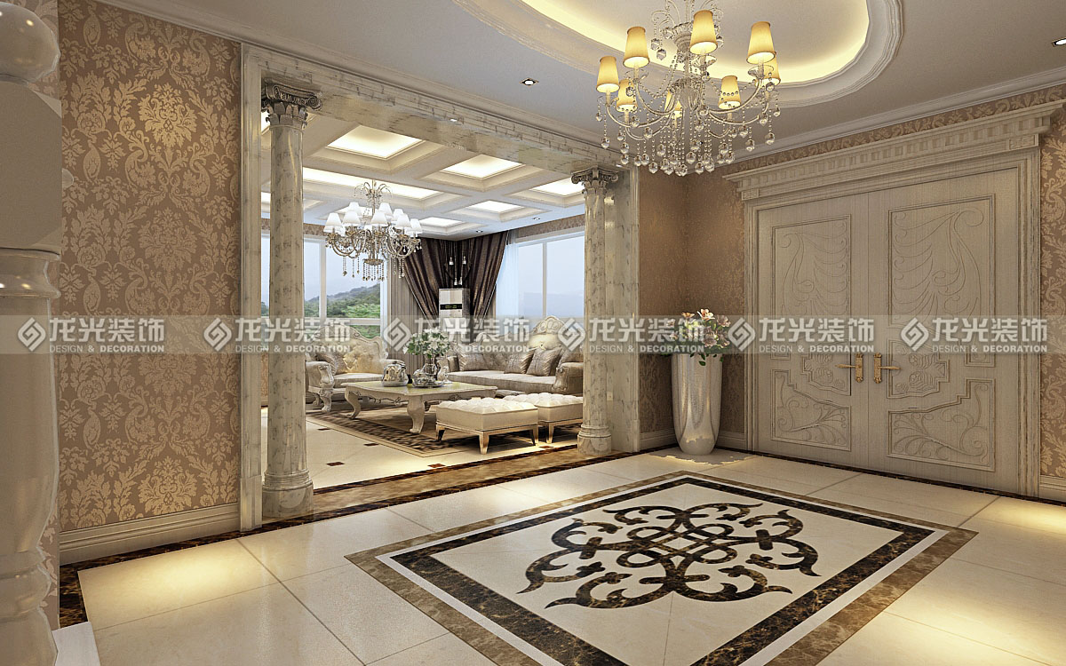 1、門廳過廊區域采用米黃色大理石瓷磚進行鋪貼,過廊頂部運用橢圓形懸浮吊頂,充分的將歐式風格的高端大氣的感覺展現出來,造型頂既增加了過廊的延伸感,又使整個區域的頂地造型有了很好的呼應,地面采用理 石拼花式設計,使得地面更加豐富多彩。